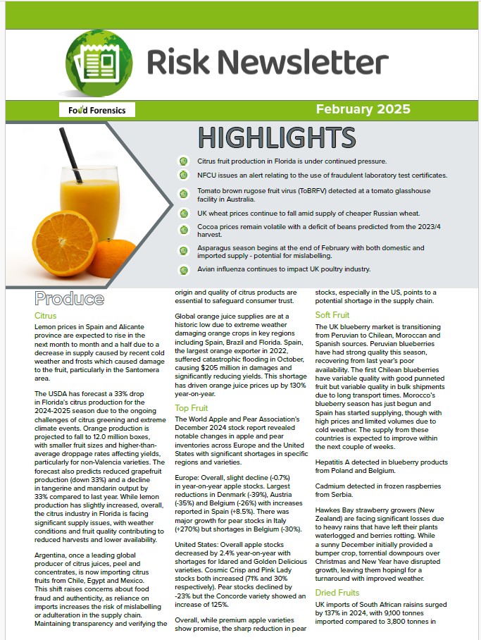 The monthly RISK newsletter is an essential tool in your horizon scanning requirements for GFSI compliance, VACCP and TACCP, customer Risk Assessments, and forms part of our fast growing Membership Scheme.